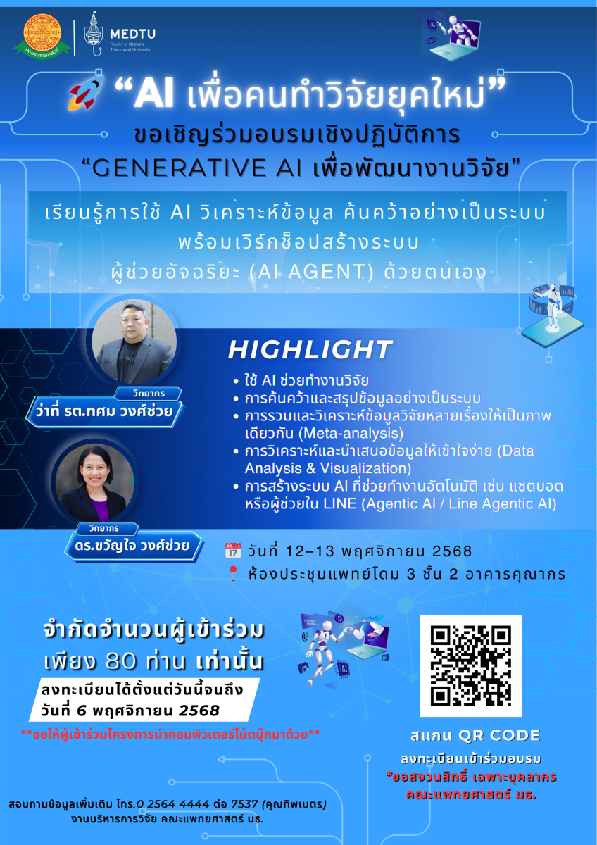 โครงการอบรมเชิงปฏิบัติการ “Generative AI เพื่อพัฒนางานวิจัย” ภายใต้หัวข้อ “AI เพื่อคนทำวิจัยยุคใหม่ : เรียนรู้การใช้ AI วิเคราะห์ข้อมูล ค้นคว้าอย่างเป็นระบบ พร้อมเวิร์กช็อปสร้างระบบผู้ช่วยอัจฉริยะ (AI Agent) ด้วยตนเอง”