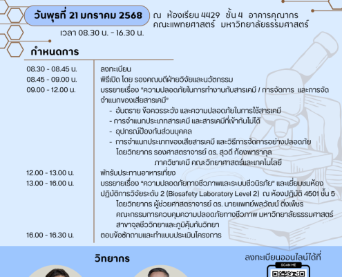 ขอเชิญผู้สนใจเข้าร่วมการอบรม เรื่อง “แนวทางการปฏิบัติงานและ ความปลอดภัยในการทำงาน ในห้องปฏิบัติการวิจัย”