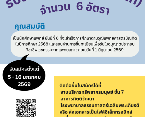 ประกาศรับสมัครแพทย์ฝากฝึกเพื่อเข้าร่วมโครงการแพทย์เพิ่มพูนทักษะปฏิบัติงานที่ โรงพยาบาลธรรมศาสตร์เฉลิมพระเกียรติ ปีงบประมาณ 2569