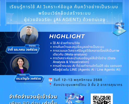 โครงการอบรมเชิงปฏิบัติการ “Generative AI เพื่อพัฒนางานวิจัย” ภายใต้หัวข้อ “AI เพื่อคนทำวิจัยยุคใหม่ : เรียนรู้การใช้ AI วิเคราะห์ข้อมูล ค้นคว้าอย่างเป็นระบบ พร้อมเวิร์กช็อปสร้างระบบผู้ช่วยอัจฉริยะ (AI Agent) ด้วยตนเอง”
