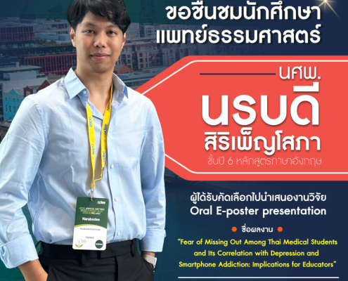 ขอชื่นชมนักศึกษา แพทย์ธรรมศาสตร์ นศพ.นรบดี สิริเพ็ญโสภา ชั้นปื 6 หลักสูตรภาษาอังกฤษ ผู้ได้รับคัดเลือกไปนำเสนองานวิจัย Oral E-poster presentation AMEE 2025 BARCELONA