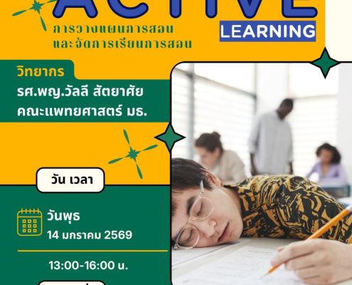 ขอเชิญอาจารย์คณะในศูนย์สุขศาสตร์ มหาวิทยาลัยธรรมศาสตร์ เข้าร่วมการอบรม Active Learning “การวางแผนการสอน และจัดการเรียนการสอนแบบ ”