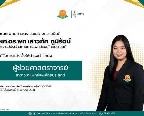ขอแสดงความยินดีกับ ผศ.ดร.พท.เสาวภัค ภูมิรัตน์ อาจารย์ประจำสถานการแพทย์แผนไทยประยุกต์ ได้รับการแต่งตั้งให้ดำรงตำแหน่ง "ผู้ช่วยศาสตราจารย์"