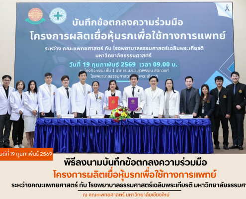 พิธีลงนามบันทึกข้อตกลงความร่วมมือโครงการผลิตเยื่อหุ้มรกเพื่อใช้ทางการแพทย์ ระหว่างคณะแพทยศาสตร์ กับ โรงพยาบาลธรรมศาสตร์เฉลิมพระเกียรติ มหาวิทยาลัยธรรมศาสตร์