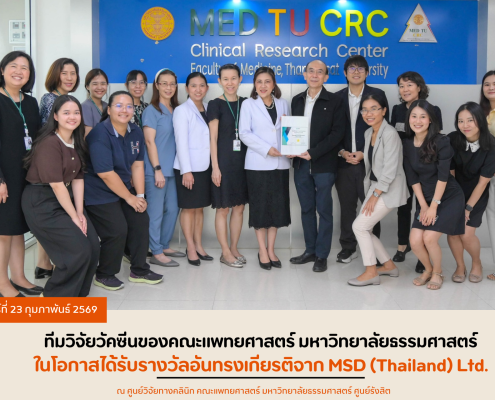 ขอแสดงความยินดีกับทีมวิจัยวัคซีนของคณะแพทยศาสตร์ มหาวิทยาลัยธรรมศาสตร์ ในโอกาสได้รับรางวัลอันทรงเกียรติจาก MSD (Thailand) Ltd.