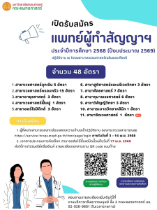 เปิดรับสมัครแพทย์ผู้ทำสัญญาฯ ประจำปีการศึกษา 2568 (ปีงบประมาณ 2569)