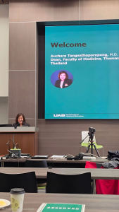 ในการนี้ รศ.พญ.อัจฉรา ตั้งสถาพรพงษ์ คณบดี ได้กล่าวสุนทรพจน์เปิดงานประชุมร่วมกับคณบดีจาก UAB