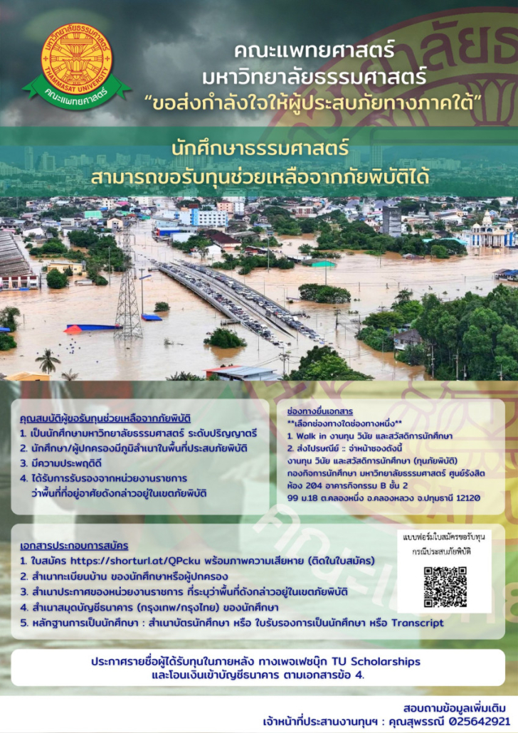 หมายเหตุ : ประกาศรายชื่อผู้ได้รับทุนในภายหลัง ทางเพจเฟซบุ๊ก TU Scholarships และโอนเงินเข้าบัญชีธนาคาร ตามเอกสารข้อ 4.
