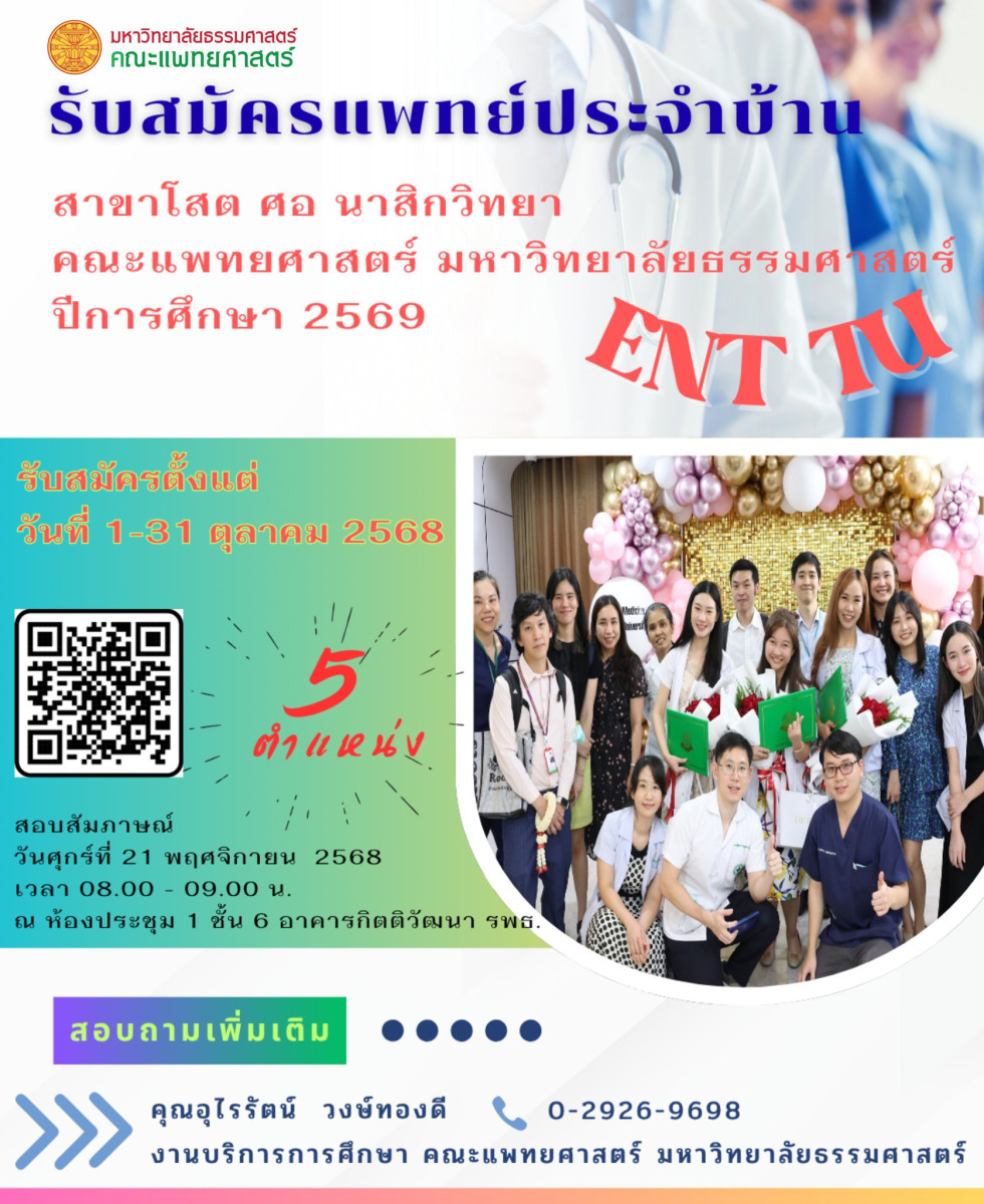 สาขาโสต ศอ นาสิกวิทยา คณะแพทยศาสตร์ มหาวิทยาลัยธรรมศาสตร์ เปิดรับสมัครแพทย์ประจำบ้าน ปีการศึกษา 2569 จำนวน 5 ตำแหน่ง