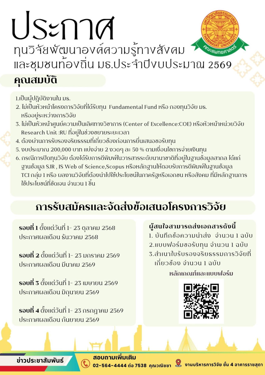 ประกาศทุนวิจัยพัฒนาองค์ความรู้ทางสังคมและชุมชนท้องถิ่น จากกองทุนวิจัย มหาวิทยาลัยธรรมศาสตร์ ประจำปีงบประมาณ 2569