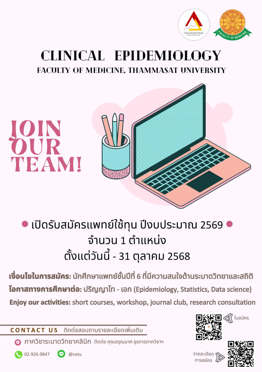ภาควิชาระบาดวิทยาคลินิก คณะแพทยศาสตร์ มหาวิทยาลัยธรรมศาสตร์ เปิดรับสมัครแพทย์ใช้ทุน จำนวน 1 อัตรา