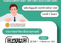 ประกาศรับสมัครบุคคลเพื่อสอบคัดเลือกเข้าศึกษาในคณะแพทยศาสตร์ มหาวิทยาลัยธรรมศาสตร์ ระดับปริญญาตรี ประจำปีการศึกษา 2569 (รอบที่ 2 โควตา)